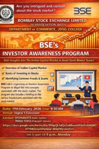 Faculty Development Program on Stress ManagementJanuary 28, 2026বোকাখাতৰ জে ডি এছ জি মহাবিদ্যালয়ৰ অসমীয়া বিভাগৰ উদ্যোগত আন্তৰ্জাতিক মাতৃভাষা দিৱস উদ্_যাপনFebruary 22, 2026 Categories Commerce Dept. Events Event Tags Share Related postsMarch 2, 2026The Department of Commerce successfully organized the inauguration programme of three Add-on Courses on 2nd March 2026 at 2:30 PM.Read moreFebruary 27, 2026Dance Workshop at JDSG CollegeRead moreJanuary 28, 2026Faculty Development Program on Stress ManagementRead more