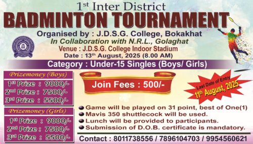 August 21, 2025Inter District Badminton Competition, organised by J.D.S.G. COLLEGE BOKAKHAT in collaboration with NRL Golaghat on 13 August 2025