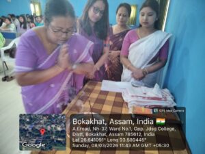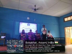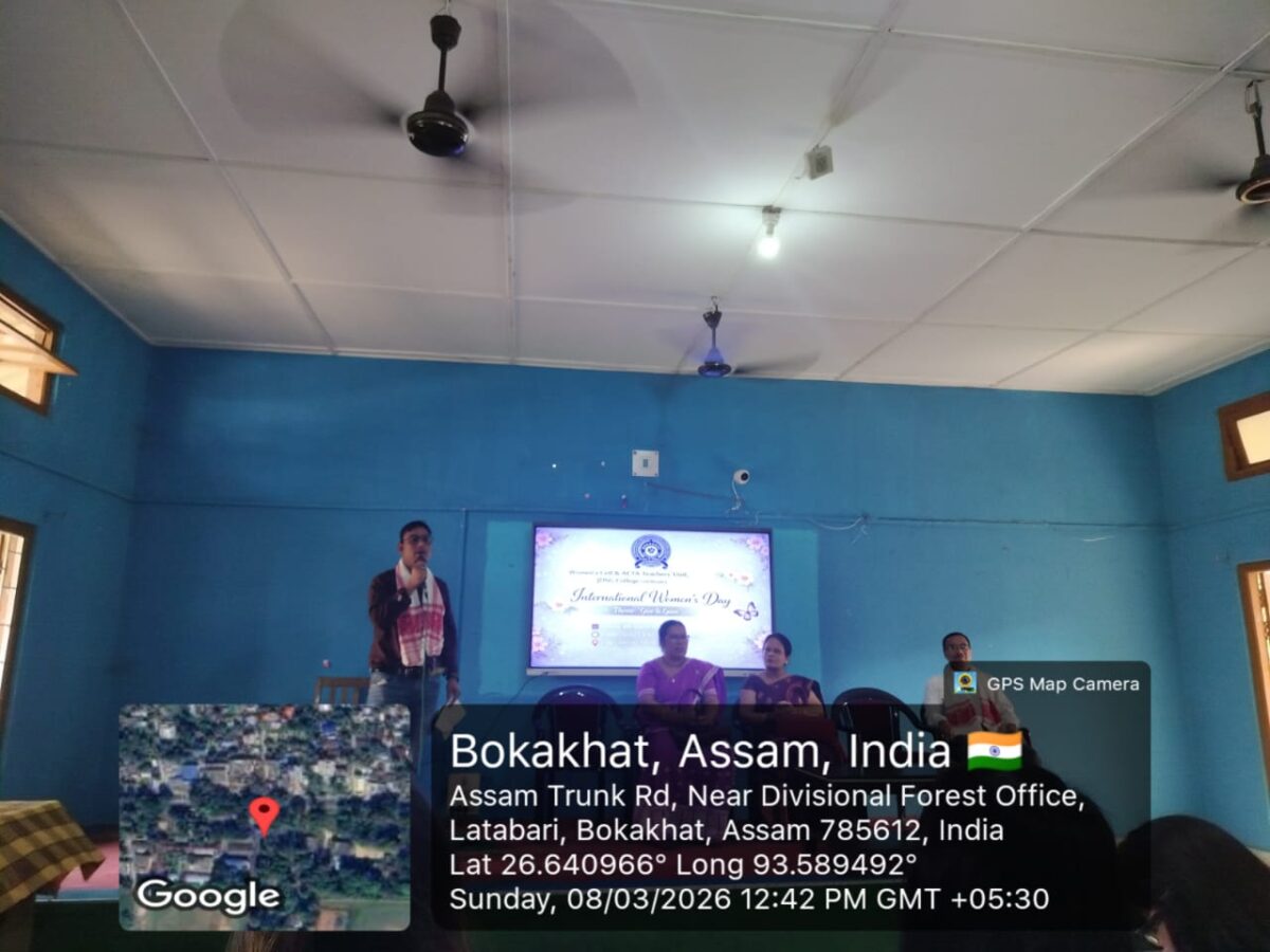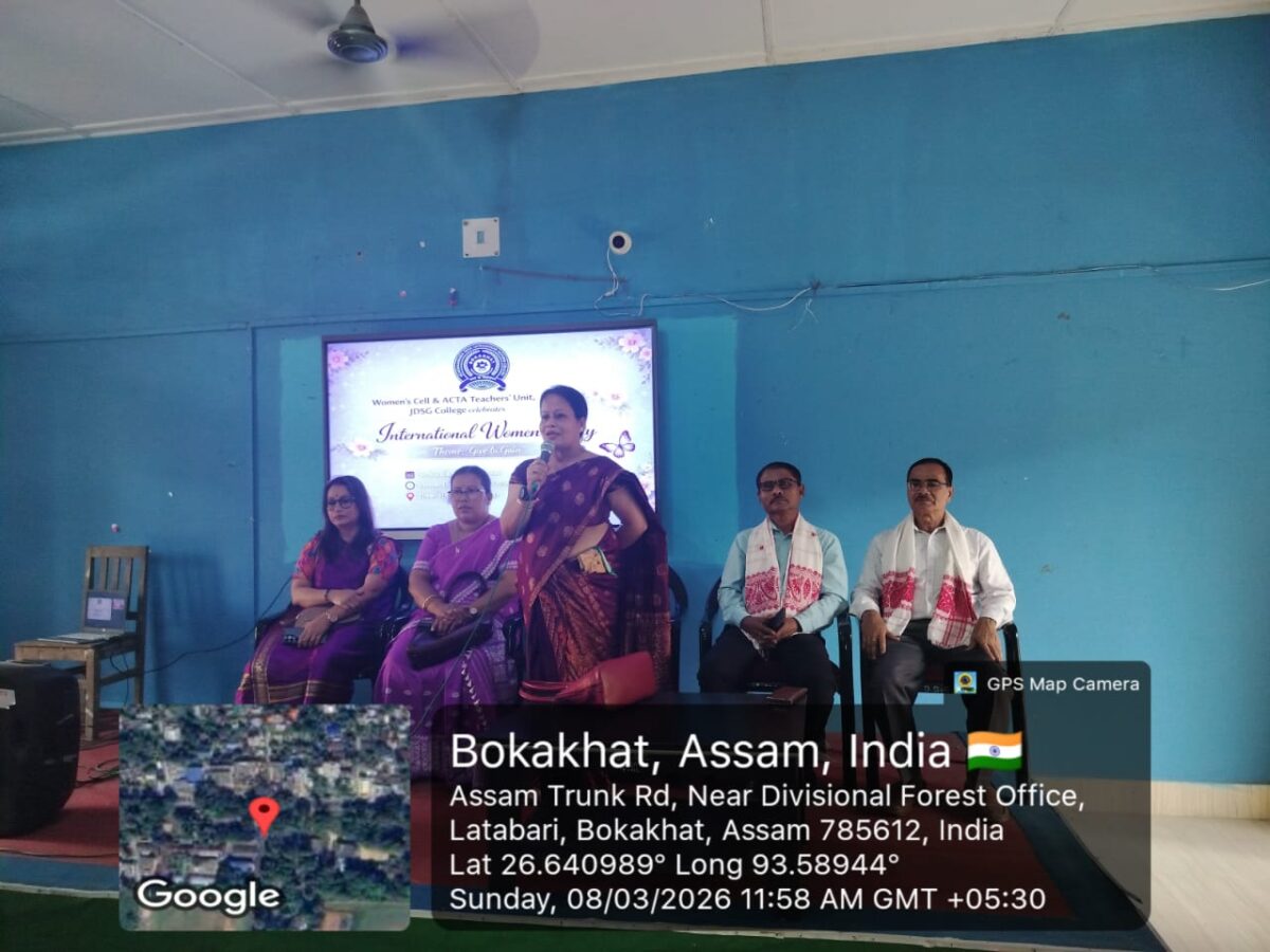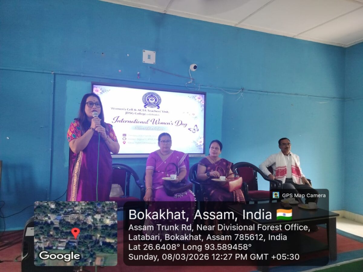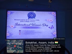 March 9, 2026JDSG College, Bokakhat observed the International Women’s Day on the 8th of March, 2026. The event was organised by Women’s Cell & ACTA Teachers’ Unit, JDSG College.The event started with a lamp-lighting ceremony. Mrs. Nibha Noni Baruah, Academic In-charge and President, Teachers’ Unit, JDSG College lit the lamp and inaugurated the event. This was followed by a song by Shyamali Das, a student of the college. Mrs. Monjumoni Neog, the President of the Women’s Cell spoke on the significance of the day.The Vice-Principal of the college, Mr. Prasanta Saikia delivered the opening address. He emphasized the need to have a balanced society where no one is denied any opportunity on the basis of gender. Mrs. Nibha Noni Baruah, in her speech shed light on how women throughout the ages have displayed strength and resilience. Dr. Monalisa Borgohain, Co-ordinator, IQAC and Secretary, Teachers’ Unit delivered a thought-provoking lecture on the importance of knowing one’s rights. She encouraged the students to be empathetic and treat everyone equally. Mr. Atul Hazarika, retired teacher, Bokakhat Higher Secondary School graced the occasion and delivered a very insightful speech. He reflected on the history of women’s rights movement and also focused on the present condition. Dr. Bidyut Jyoti Kalita, Assistant Professor, Department of Commerce delivered the keynote address. His speech focused on the different roles women perform throughout their lives.